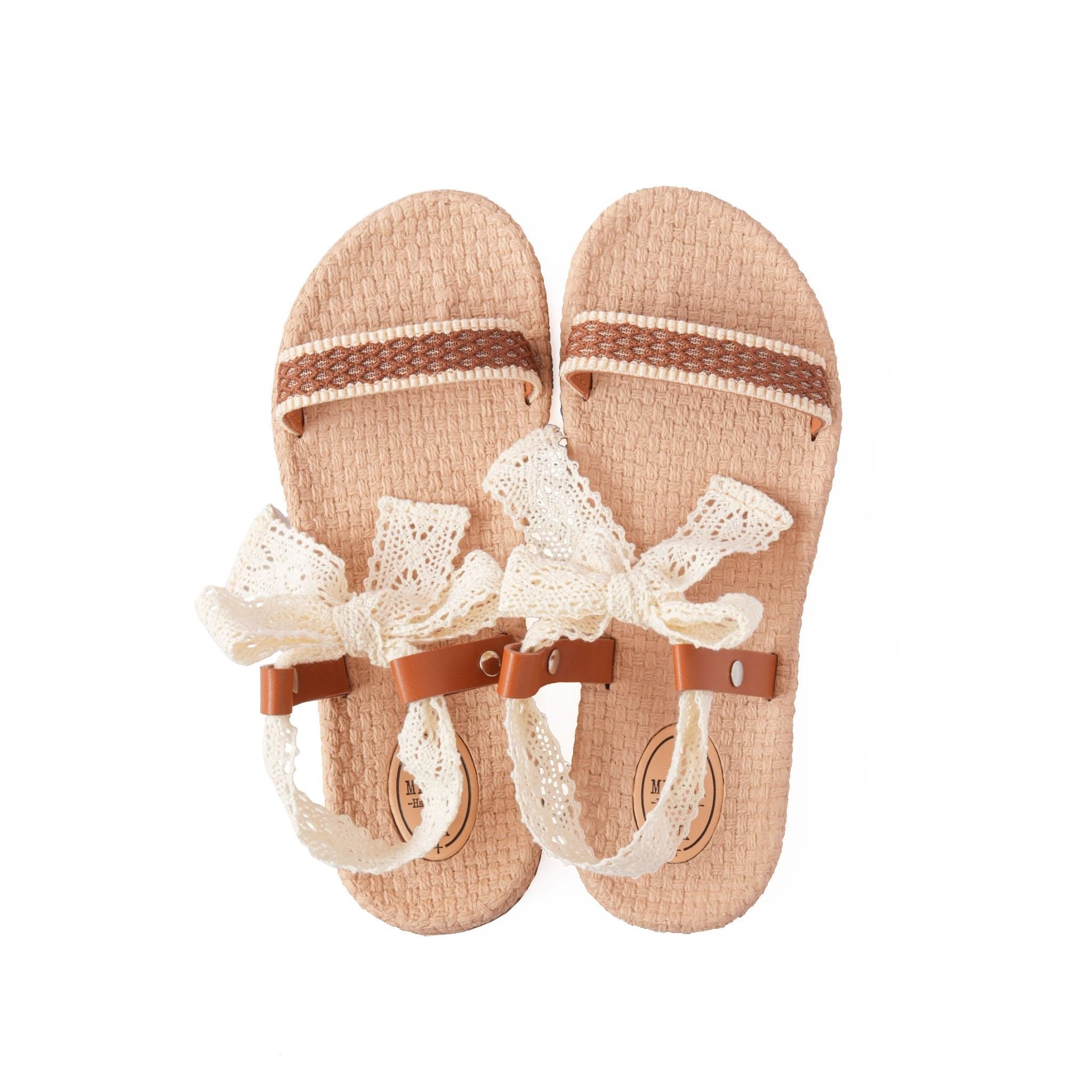 ナチュラルな編み込みソールに、繊細なレース素材のリボンとブラウンレザー調ベルトを組み合わせ、フェミニンさと上品さを両立しました。