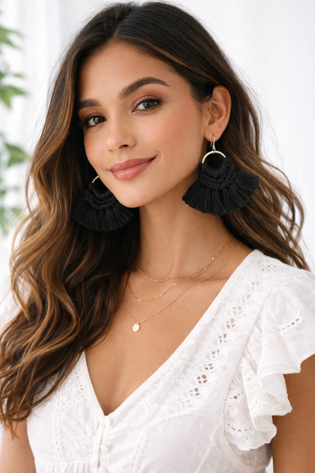 丁寧に編み上げられた立体的なデザインと、ふんわり広がるフリンジが軽やかな動きを生み出し、顔まわりにやさしい存在感をプラスします。