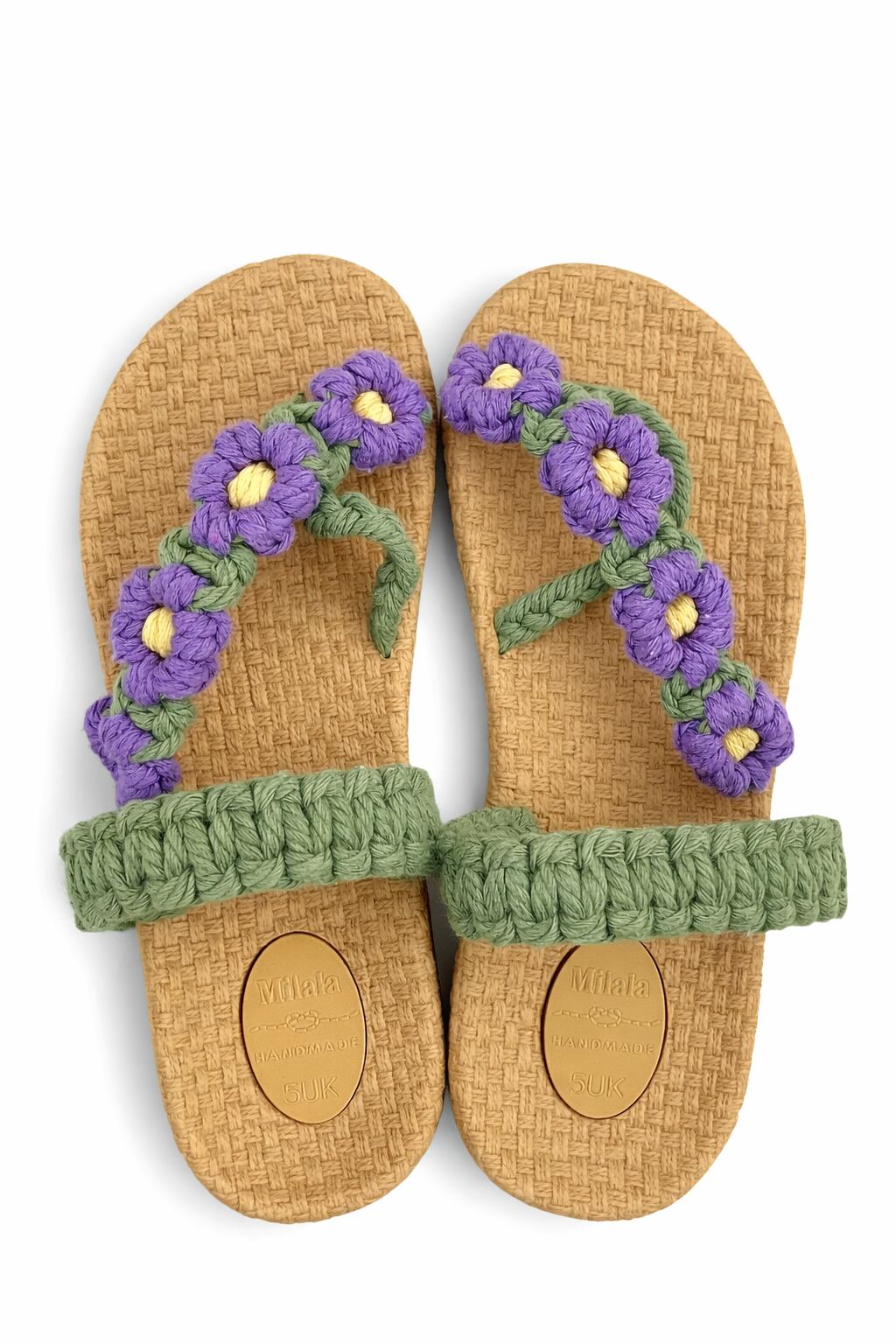 落ち着いたグリーンのマクラメ編みに、パープルのフラワーモチーフが映えるデザインで、ナチュラルさの中に華やかさをプラスします。