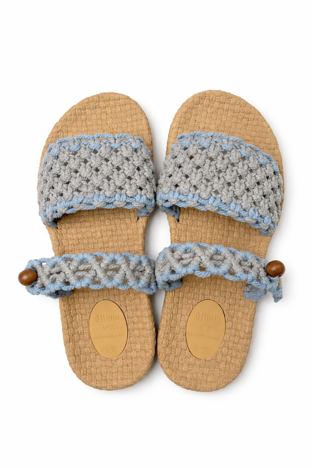 立体的に編み込まれたマクラメデザインが印象的で、やわらかなグレーに淡いブルーの縁取りが軽やかなアクセントを添えています。落ち着きのあるカラーリングが、足元にさりげないおしゃれ感をプラス。