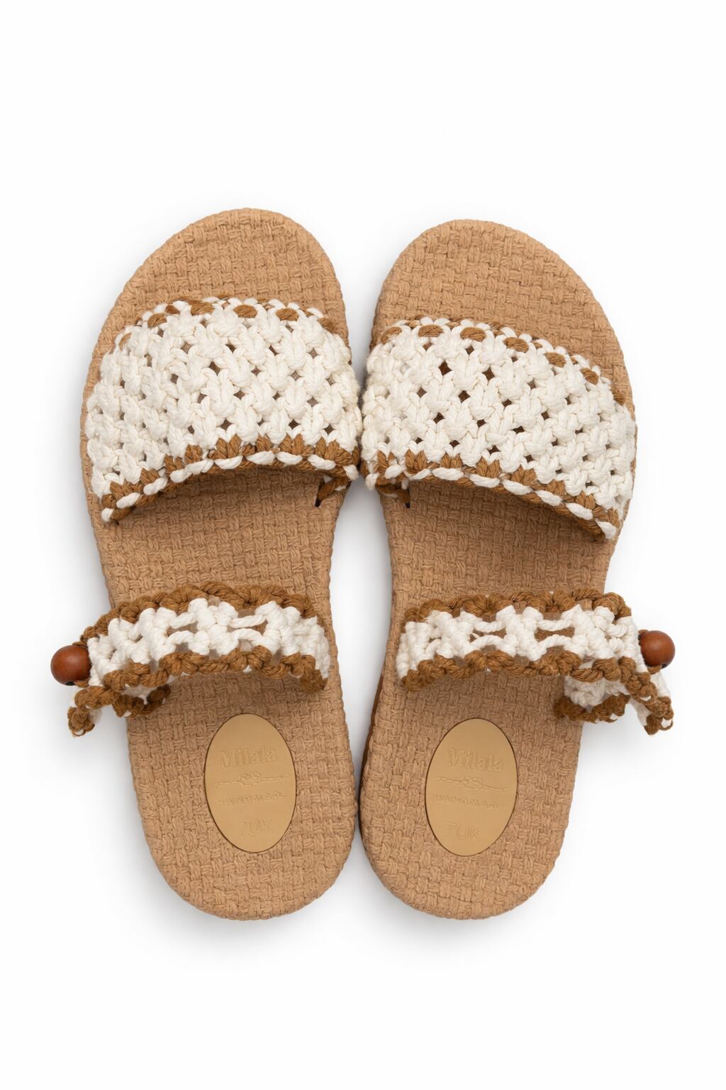 立体的に丁寧に編み込まれたマクラメデザインは、軽やかで通気性がよく、春夏の足元にぴったり。